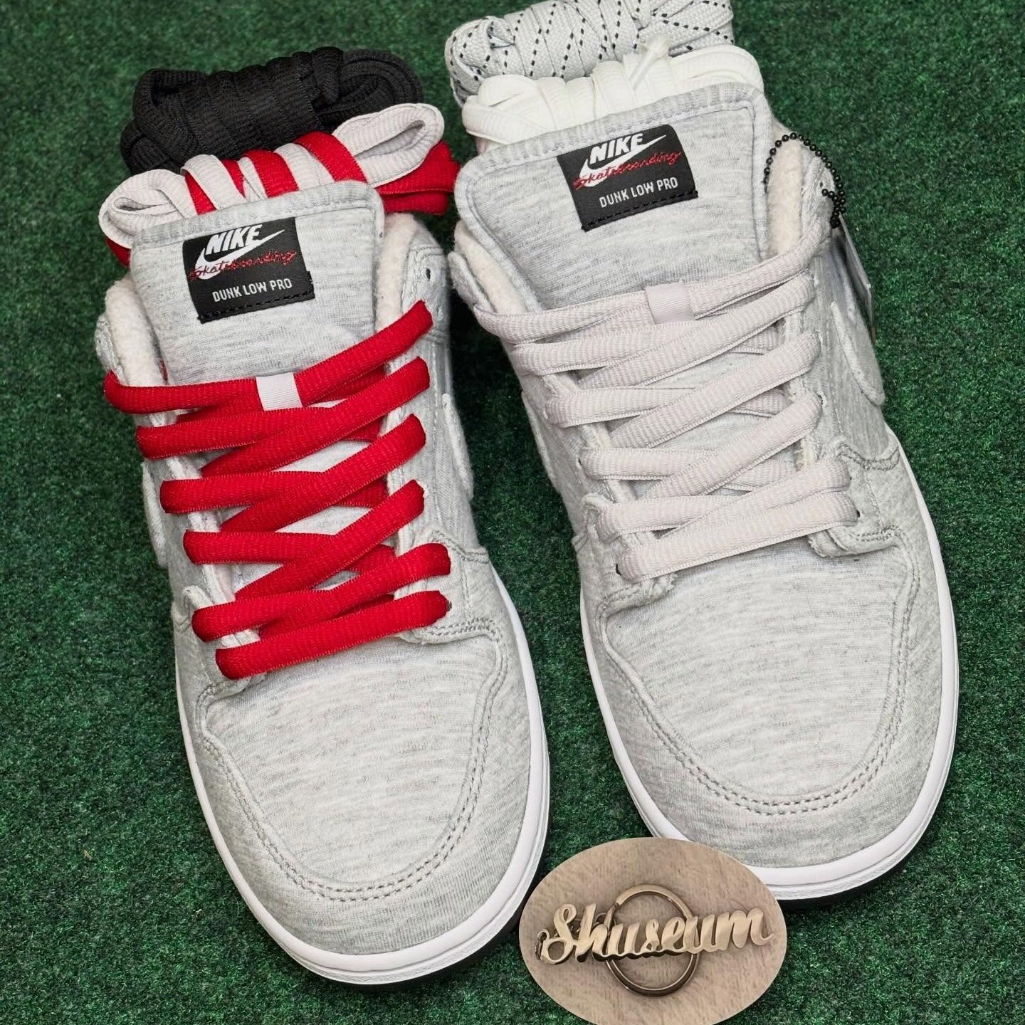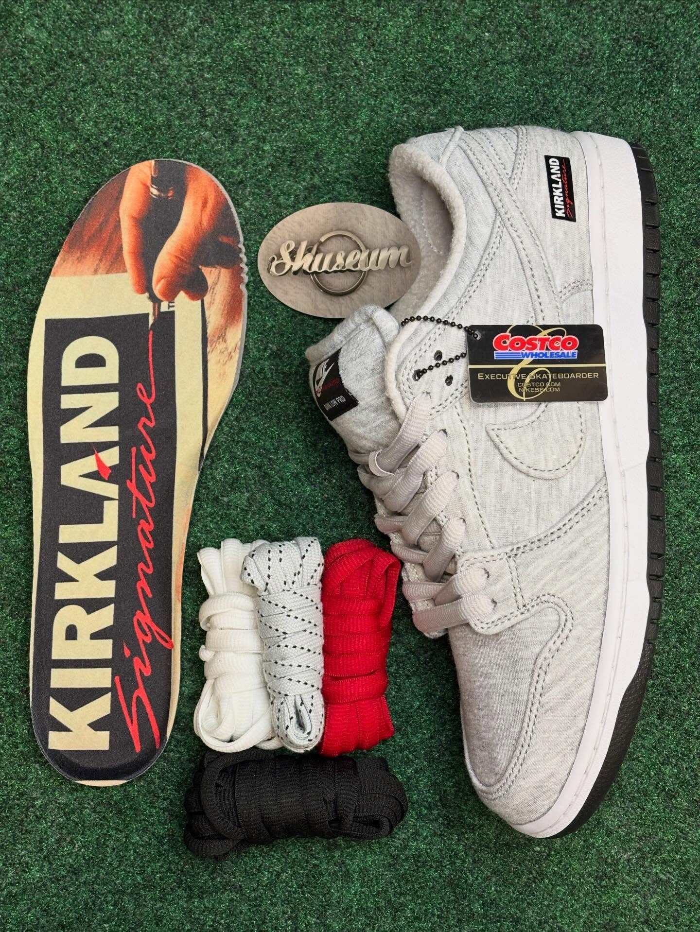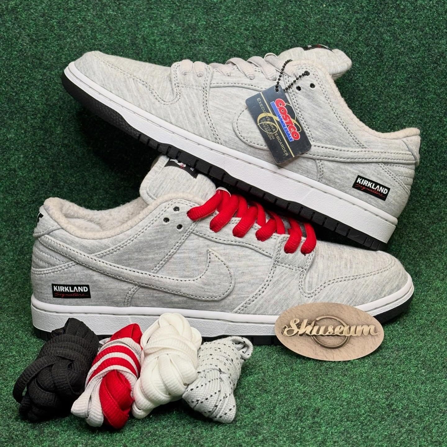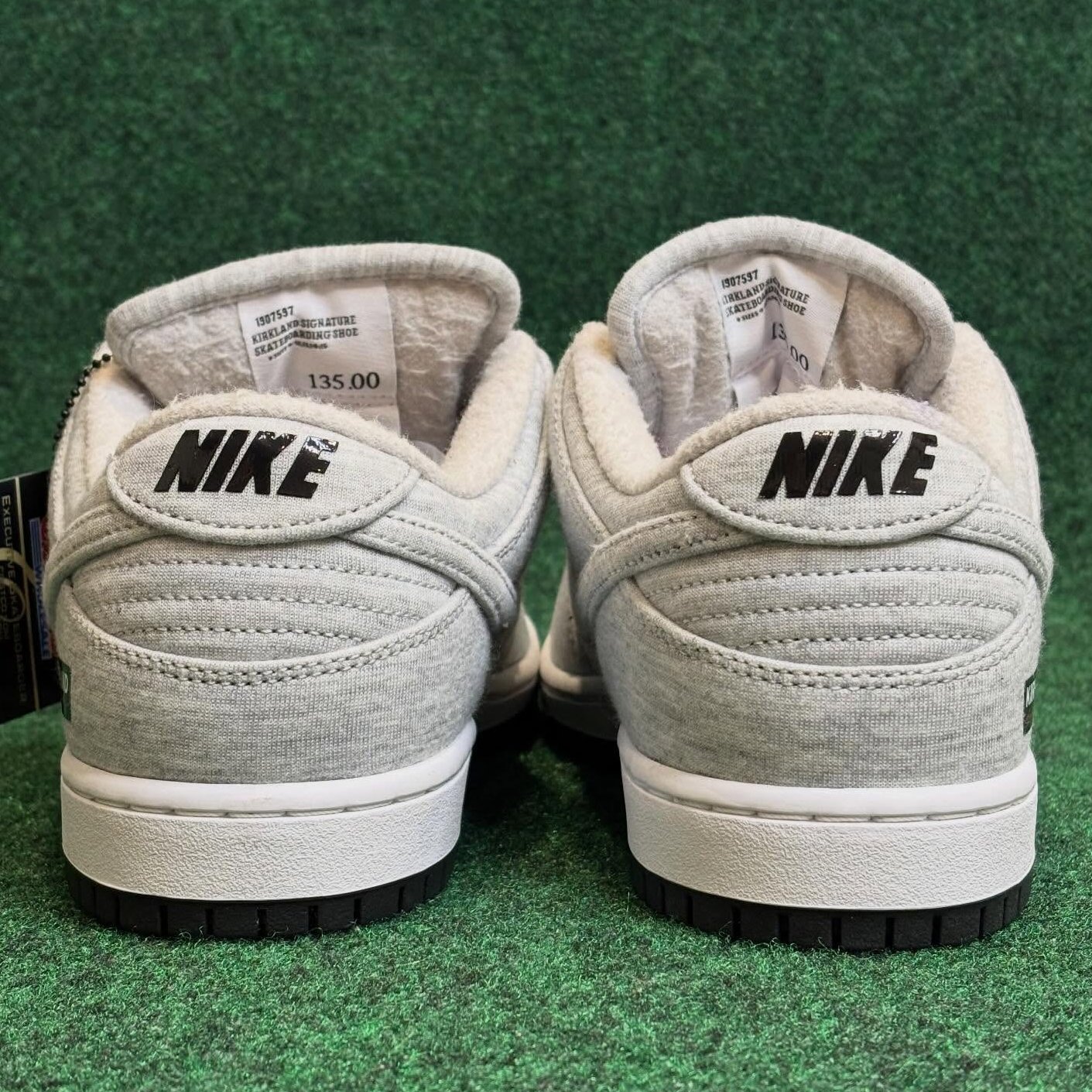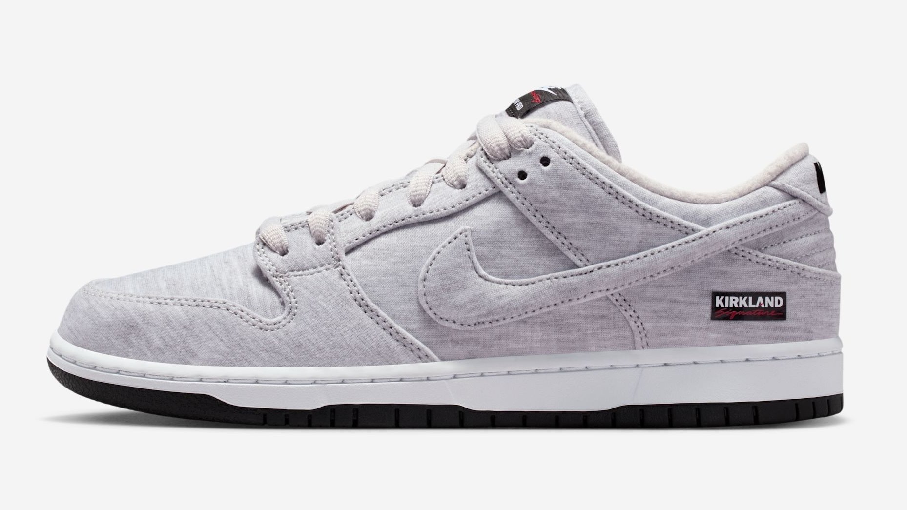 このKirkland Signature x Nike SB Dunk Low(スタイルコード: IF0673-001)は、Grey Fogを基調とした柔らかなフリース素材のアッパーが最大の魅力。触れるだけで、Kirklandのあの安価で暖かいスウェットパンツを連想させる。内側はパイルライニングで優しく包み込み、冬のスケートセッションや日常の大量買い出しに最適だ。ヒールにはKirklandのクラシックなボックスロゴが刺繍され、タンは通常の“Nike SB”ではなく、赤いカーシブ字体で“skateboarding”と記されている。Nike SBらしい、さりげないユーモアが光る。