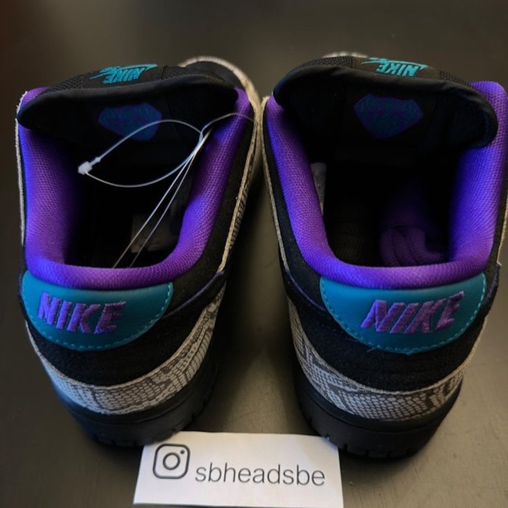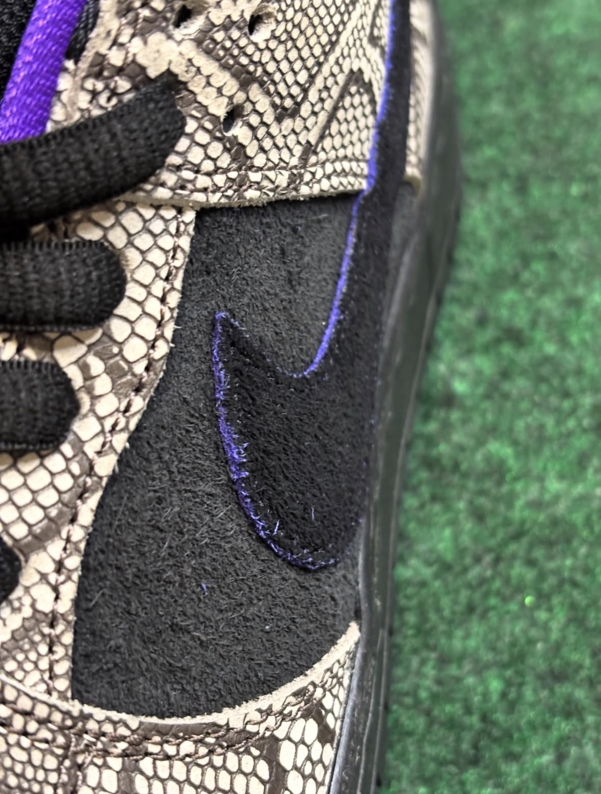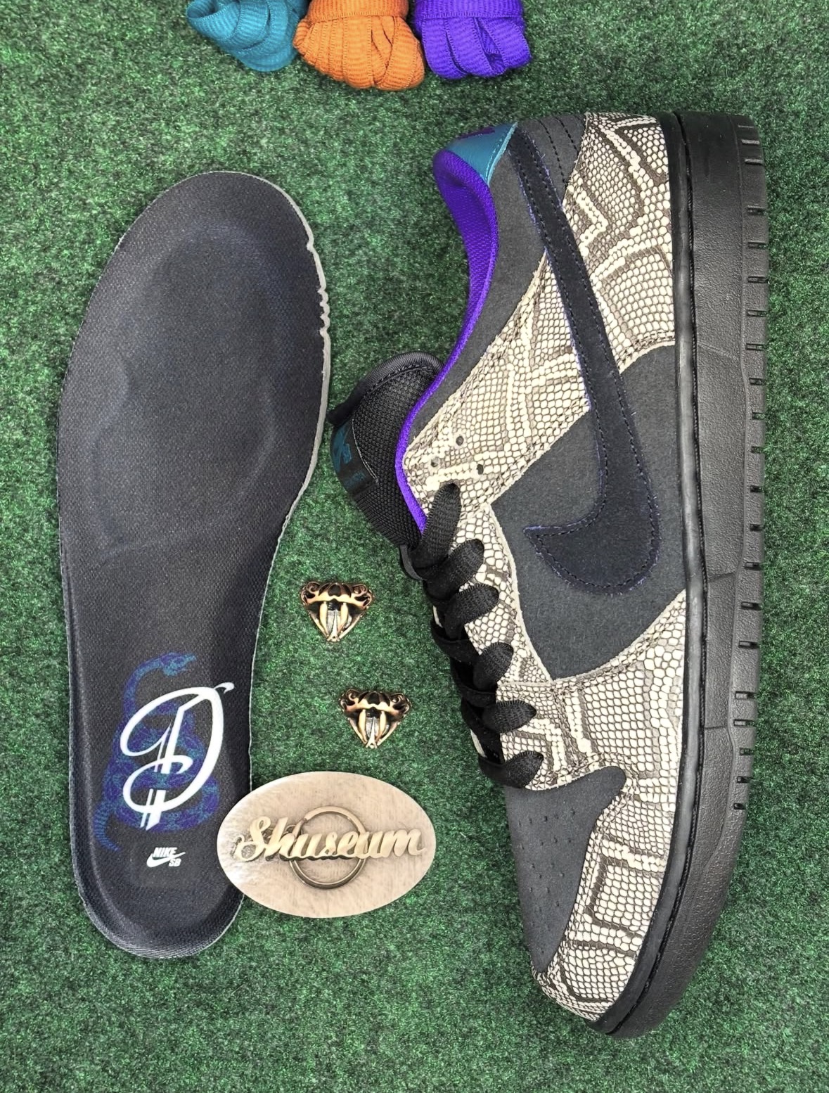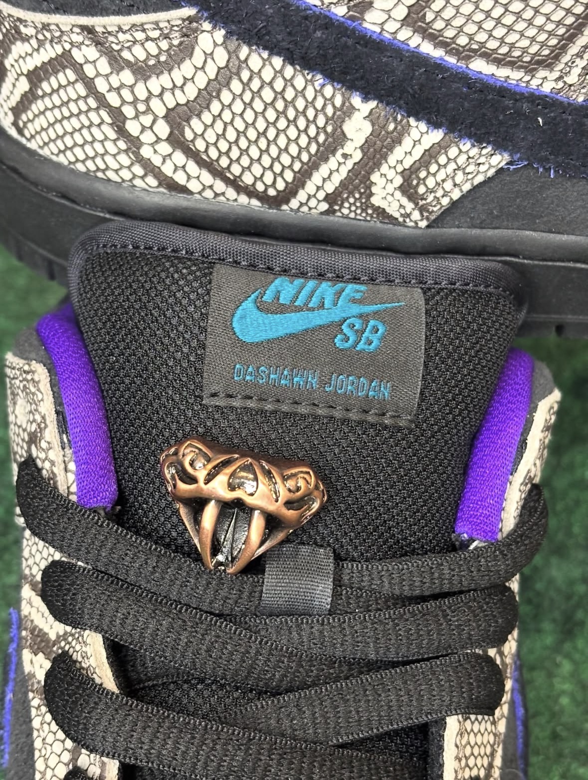 アッパーはオフホワイトのスエードをベースに、グレーのフェイクスネークスキンオーバーレイがトゥ、アイステイ、ヒールを覆う。まるでヘビの鱗が這うようなテクスチャーが、視線を釘付けにする。スウッシュのトリムやタングタグ、ヒールタブに散りばめられたブライトスプルース(ターコイズ)とフィアスパープルが、クールで毒々しい輝きを放つ。レースデュブレはダイヤモンドシェイプに牙を模したデザインで、インソールにはガラガラヘビが巻き付いた「DJ」ロゴがプリント——細部まで彼のストーリーが刻み込まれている。