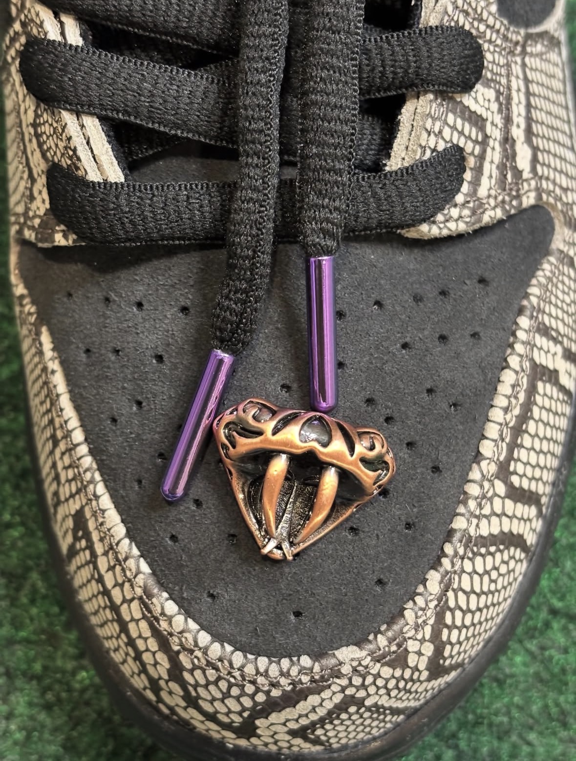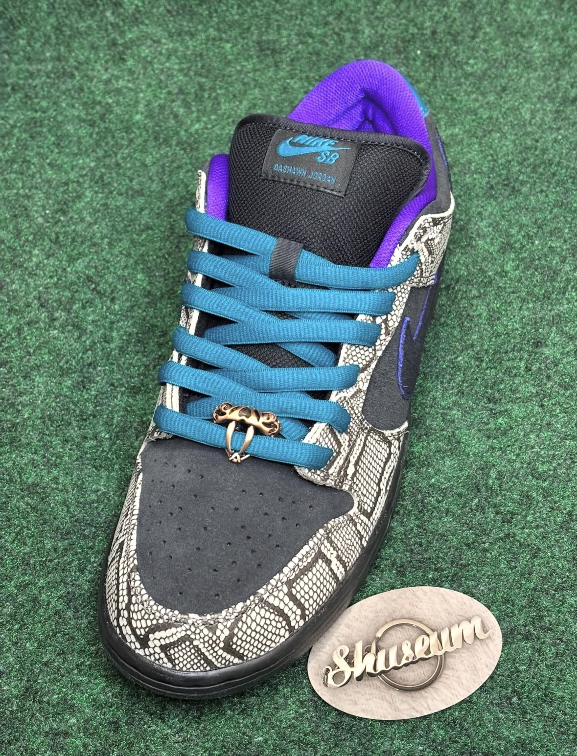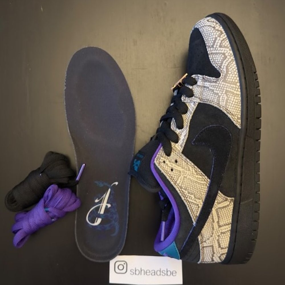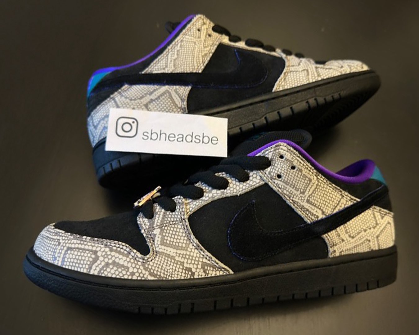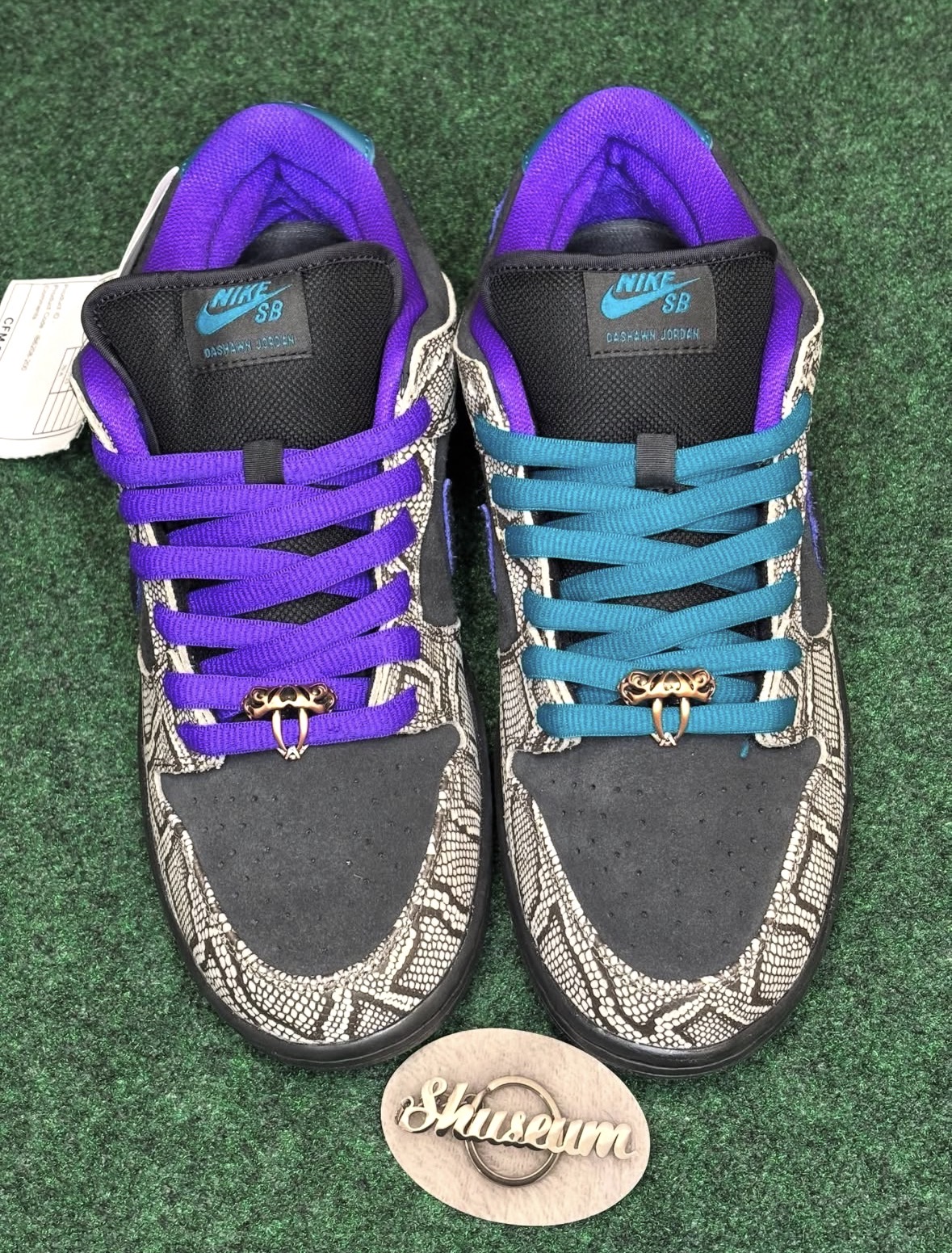 アッパーはオフホワイトのスエードをベースに、グレーのフェイクスネークスキンオーバーレイがトゥ、アイステイ、ヒールを覆う。まるでヘビの鱗が這うようなテクスチャーが、視線を釘付けにする。スウッシュのトリムやタングタグ、ヒールタブに散りばめられたブライトスプルース(ターコイズ)とフィアスパープルが、クールで毒々しい輝きを放つ。レースデュブレはダイヤモンドシェイプに牙を模したデザインで、インソールにはガラガラヘビが巻き付いた「DJ」ロゴがプリント——細部まで彼のストーリーが刻み込まれている。