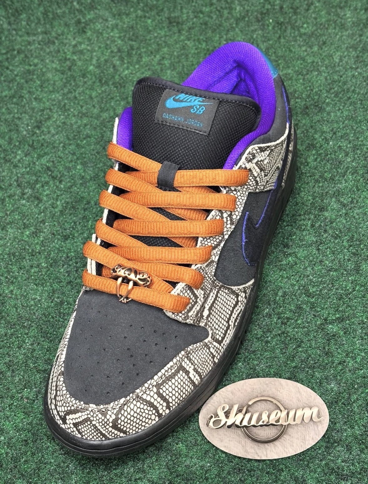 このコラボのインスピレーションは、故郷アリゾナの過酷な自然と、そこに息づく野生の象徴——ダイヤモンドバックガラガラヘビ(Diamondback Rattlesnake)。さらに、MLBアリゾナ・ダイヤモンドバックスのオリジナルユニフォームから着想を得たターコイズとパープルのアクセントが、砂漠の夕焼けを思わせるドラマチックなコントラストを生み出している。Jordan本人が長年温めていた「アリゾナの色でDunkを作りたい」という夢が、ついに形になったのだ。
