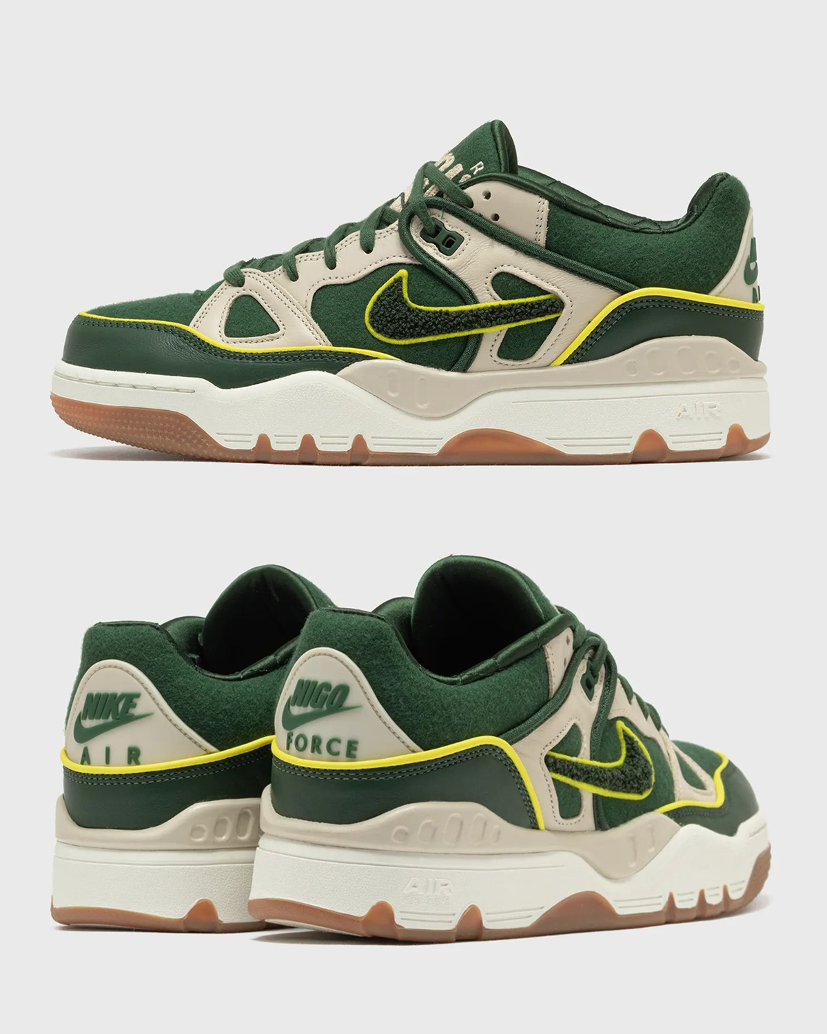 アメリカのカレッジスポーツ文化にオマージュを捧げたこのパックは、2つのアイコニックなカラーリングで構成される。ひとつはミッドナイトネイビーとグレーの組み合わせ。ふわっとしたフェルトアッパーにレザーのオーバーレイを重ね、クッション性の高いサテンライニングが内側に潜む。まるでGeorgetown University Hoyasのクラシックなユニフォームを思わせる洗練されたトーンは、ストリートでありながら上品な佇まいを放つ。もうひとつはフォレストグリーンとイエローの鮮やかなコントラスト。Nikeの本拠地オレゴン州を象徴するUniversity of Oregon Ducksを彷彿とさせるビビッドな配色は、ヴィンテージ感あふれる素材使いで遊び心を加味している。