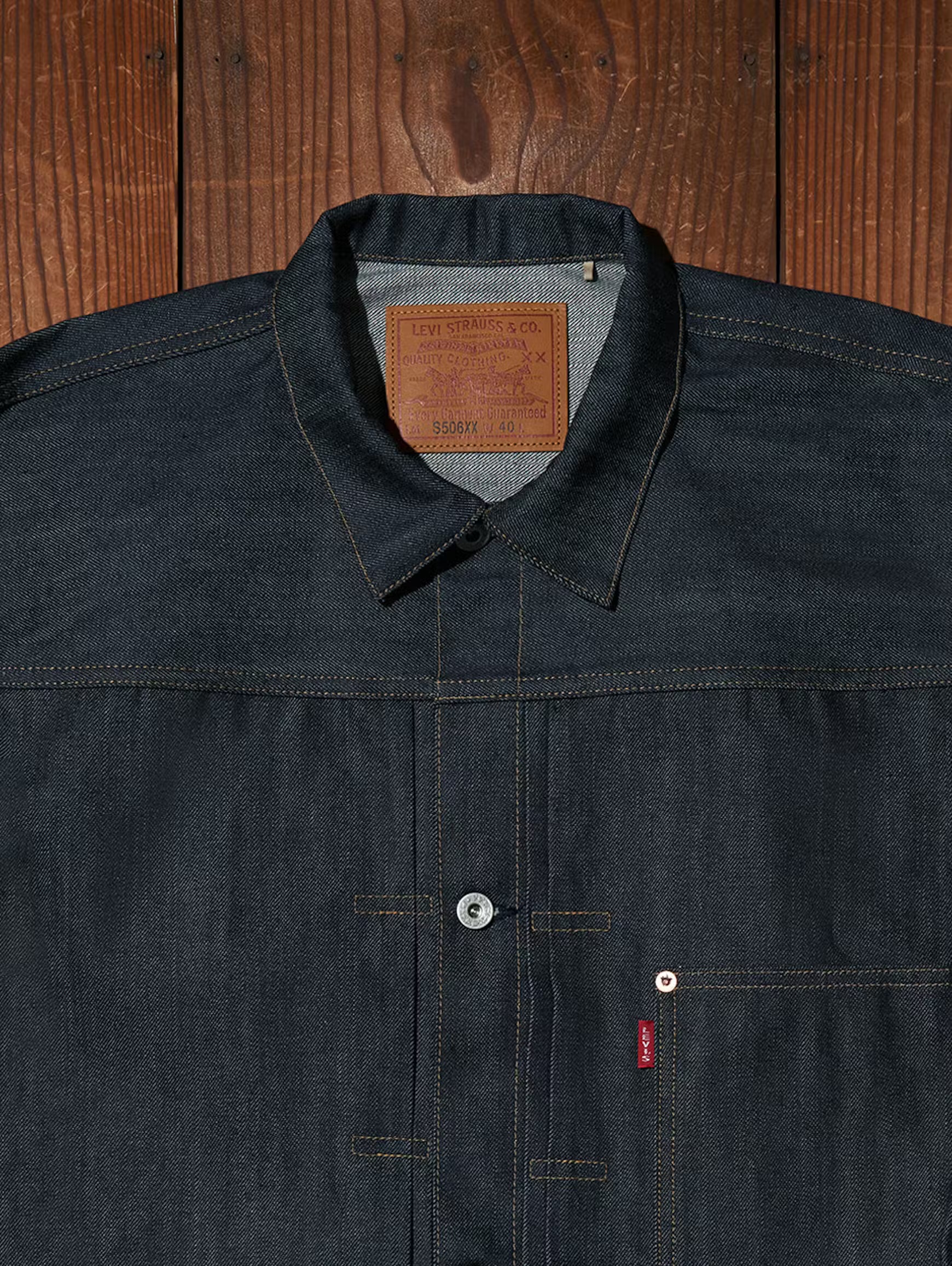 パッチに刻まれた「S506XX」の“S”は“SIMPLIFY(簡略化)”の頭文字。一時的な戦時モデルであることを示す、歴史の証でもある。また、46サイズ以上には背ヨークが分割された通称“Tバック”が採用され、パッチにはエクストララージを示す“E”の刻印が加わるなど、サイズごとのディテール違いも見逃せない。