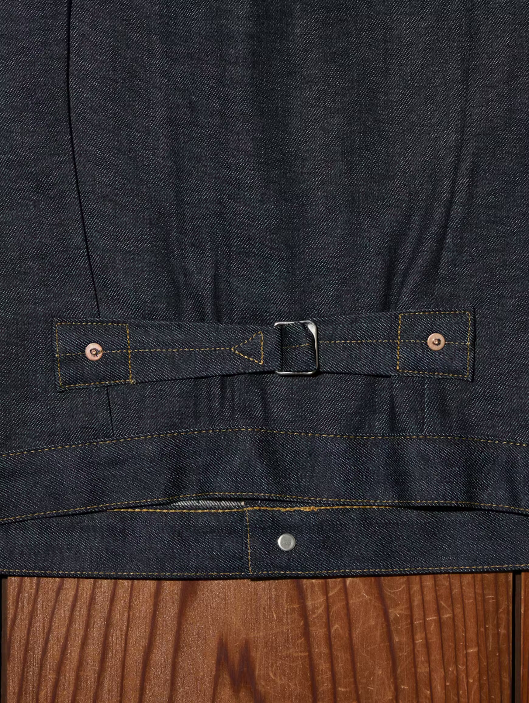 なお、生デニムゆえに初回洗いでは約10%の縮みが予想される。特にタンブラー乾燥を行うとさらに縮む可能性があるため、サイズ選びは慎重に。色落ちも激しく、淡色アイテムやソファへの色移りに注意が必要だ。