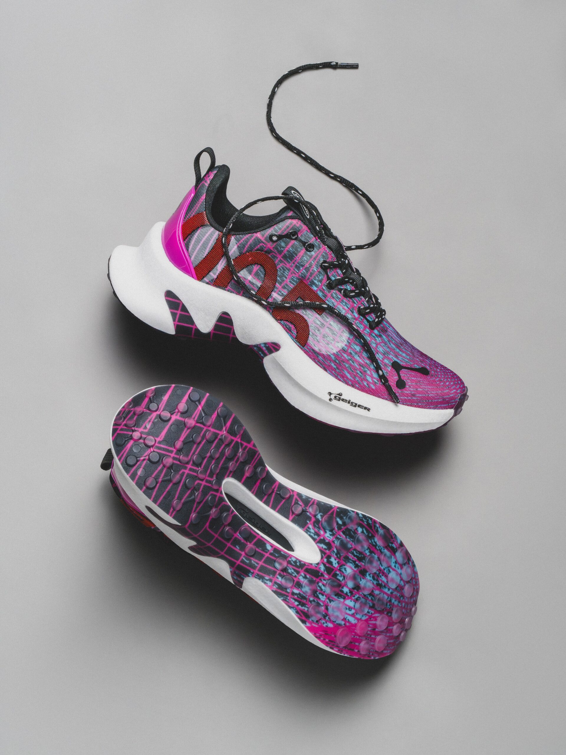 深いミッドナイトパープルを基調としたアッパーは、単なる色合い以上の魔法を宿している。3Dプリント技術で施された「005」のナンバリングが、着用者の動きに合わせて微妙に色をシフトさせるのだ。静止時は神秘的なダークパープルが支配するが、歩みを進めるごとに隠されたティールのアクセントが顔を覗かせ、光の加減で幻想的に輝く。このダイナミックな視覚効果は、John Geigerがこれまでで「最高の005カラーウェイ」と自負するだけの実力を発揮している。