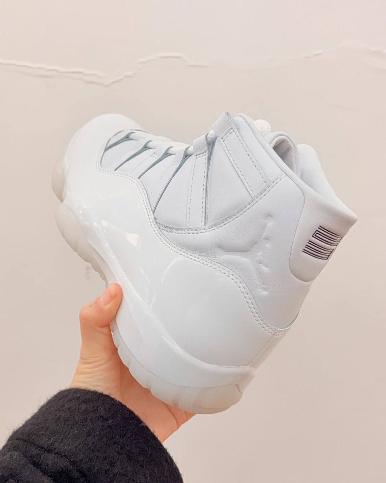 この“White”カラーウェイは、徹底したトーン・オン・トーンの白一色で構成されている。象徴的なパテントレザーのマッドガードは、眩いほどの純白に染められ、ミッドソール、アウトソール、そしてジャンプマンロゴに至るまで、ほとんど一切の色味を排除。わずかにオフホワイトが漂う絶妙なグラデーションが、かえってその潔さを際立たせる。いつものAir Jordan 11のプロポーションはそのままに、COMME des GARÇONSらしい過剰を削ぎ落としたミニマリズムが、圧倒的な高級感と静謐さを生み出している。