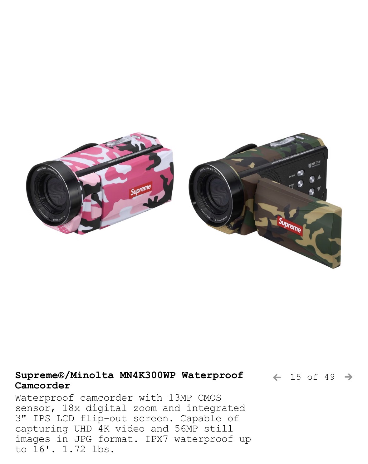 Supremeのアクセサリー戦略は毎シーズン「予想外」を武器にする。SS26では棺桶(Titan Orion Casket)やDualitトースターなど奇抜なラインナップの中に、このカムコーダーが並ぶことで「実用×ユーモア」のバランスが絶妙。夏のフェス、旅行、日常のVlog撮影——すべてをSupreme色に染め上げるツールとして、ピンクカモはガーリーストリート、グリーンカモはミリタリー×スケーターの両極をカバーする。