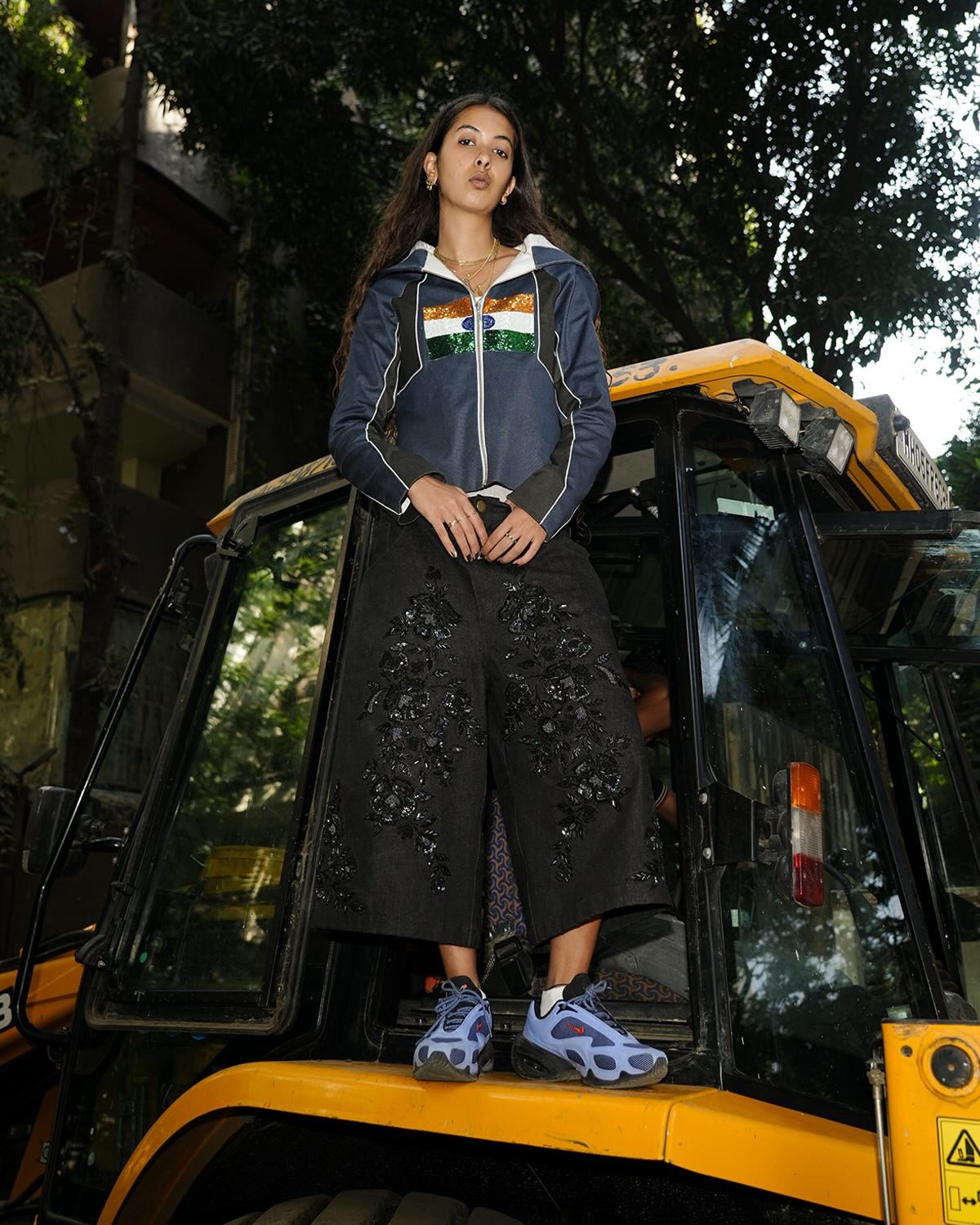 ムンバイの喧騒の中、建設現場の重機に腰掛けてクールにポーズを決める少女。灰色のAir Maxを履き、刺繍が輝く自作のデニムパンツとブルーのジャケットをまとった彼女の姿が、2026年に入って一気に世界のタイムラインを駆け巡った。