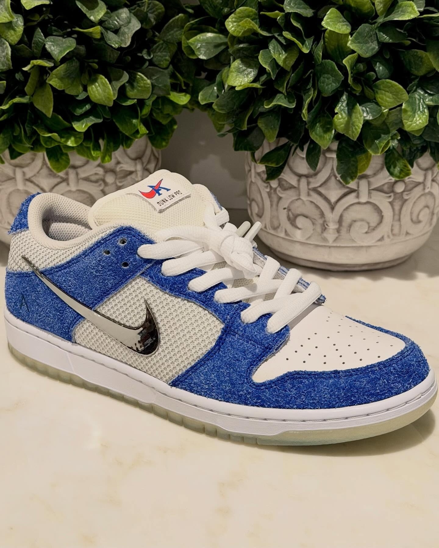 白いメッシュベースに、深いロイヤルブルーのスエードオーバーレイを纏ったこのサンプル。リリース版のTurbo Greenよりも濃密でクラシックなブルートーンが、まるで2005年のDiamond Supply Co. “Tiffany” Dunkや2021年の“Hyper Royal”を思わせるノスタルジックな魅力を放つ。クローム調のメタリックシルバーSwooshが光を反射し、ヒールにはAprilのローズモチーフとコーブランディングが控えめに主張。アイシーな半透明アウトソールの下には、ブランドシグネチャーの薔薇グラフィックが隠れているのも変わらず。