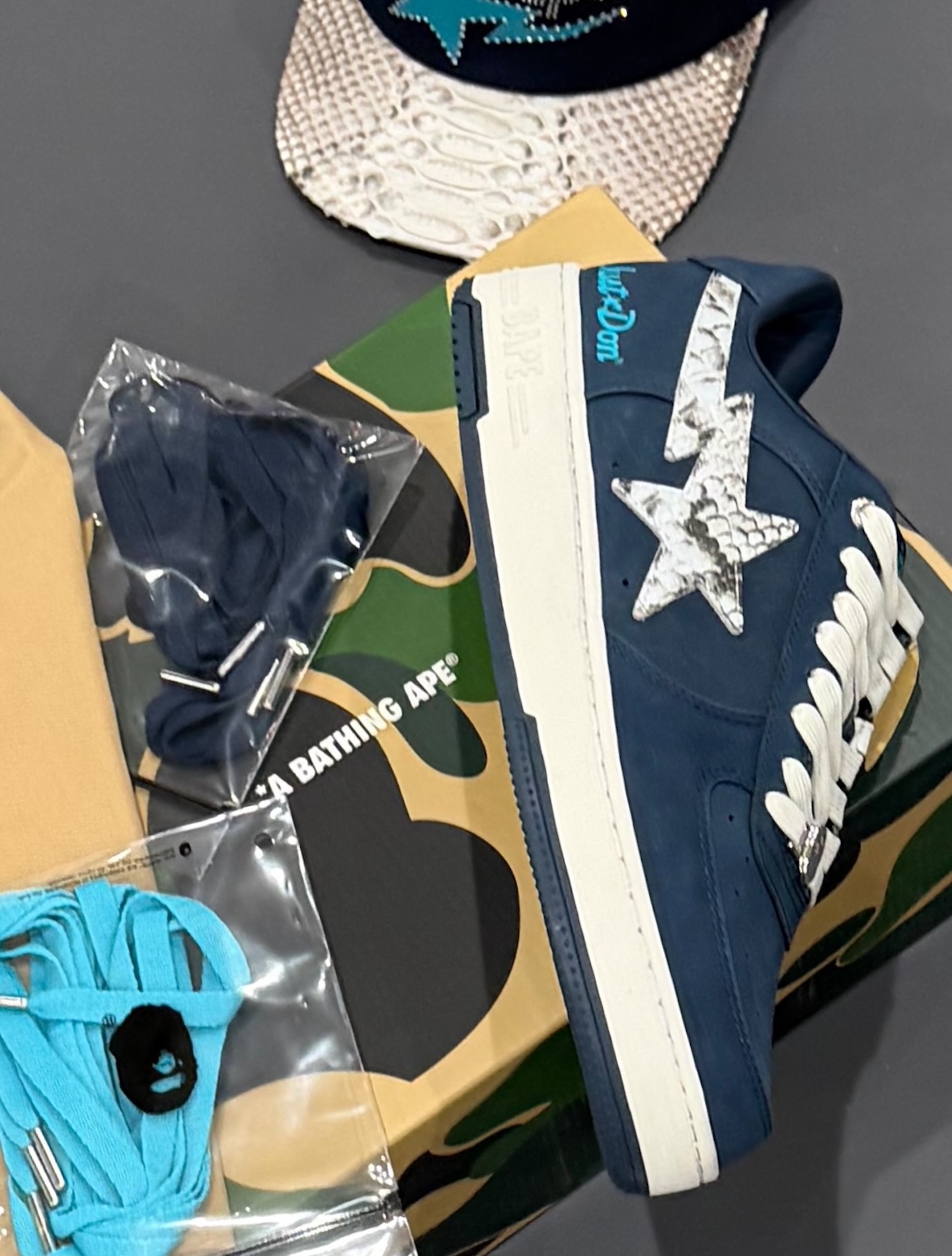 パッケージングもBAPEらしいこだわりが光る。アイコニックなカモ柄のボックスに収められ、開封の瞬間から特別感を味わえる仕様だ。BAPE STAのクラシックなシルエットに、Just Donが得意とするプレミアム素材(ここではフェイクパイソン)のエッセンスが融合したことで、ストリートウェアの枠を超えたラグジュアリーな一足に昇華されている。