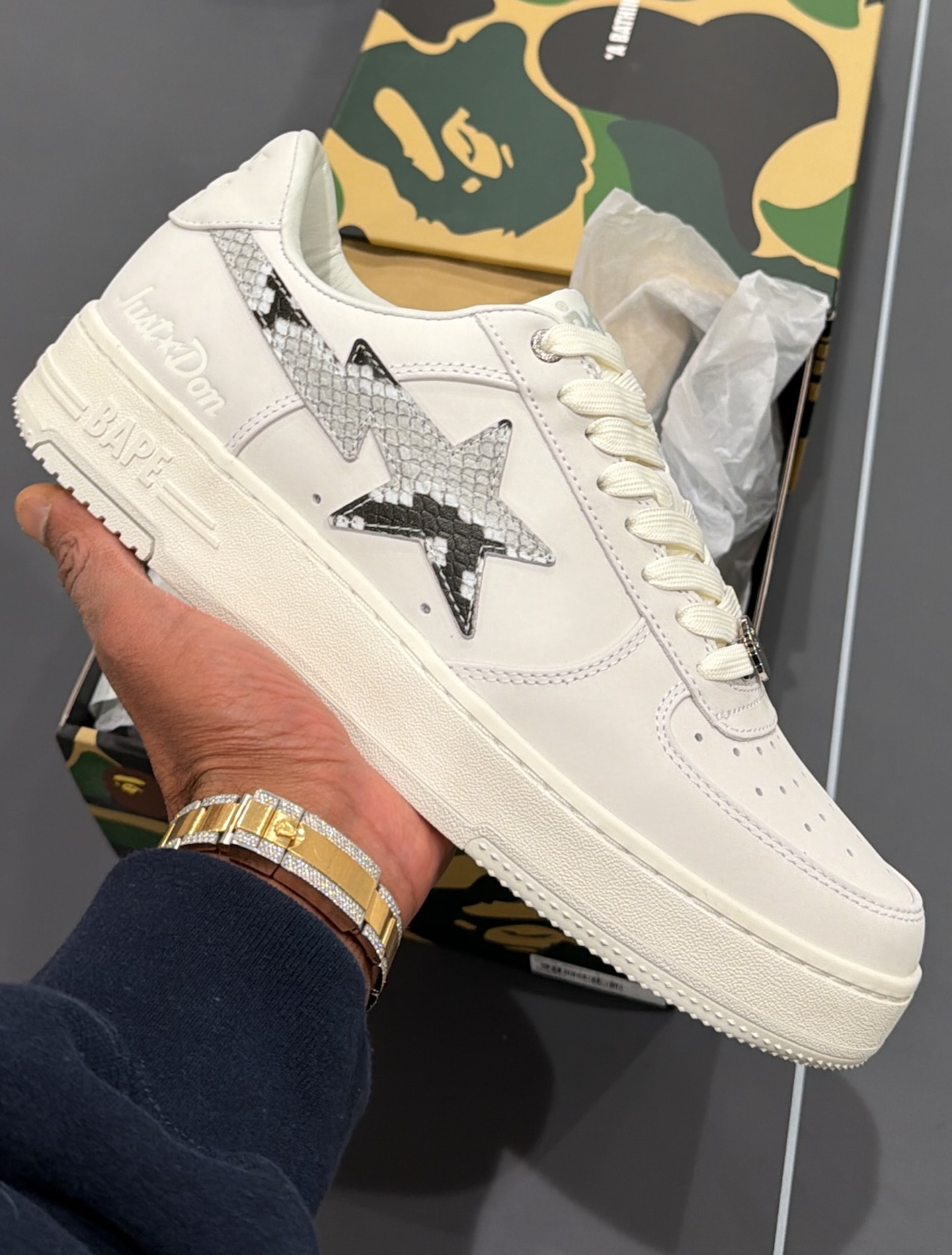 パッケージングもBAPEらしいこだわりが光る。アイコニックなカモ柄のボックスに収められ、開封の瞬間から特別感を味わえる仕様だ。BAPE STAのクラシックなシルエットに、Just Donが得意とするプレミアム素材(ここではフェイクパイソン)のエッセンスが融合したことで、ストリートウェアの枠を超えたラグジュアリーな一足に昇華されている。