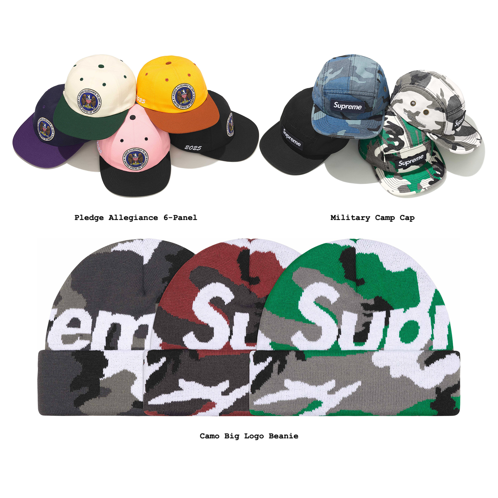 定番の温かみを加えるのは、Big Logo BeanieとCamo Big Logo Beanie、そしてMilitary Camp Cap。シンプルながらSupremeのアイコニックなロゴが際立ち、冬のコーディネートに欠かせない存在感を発揮する。